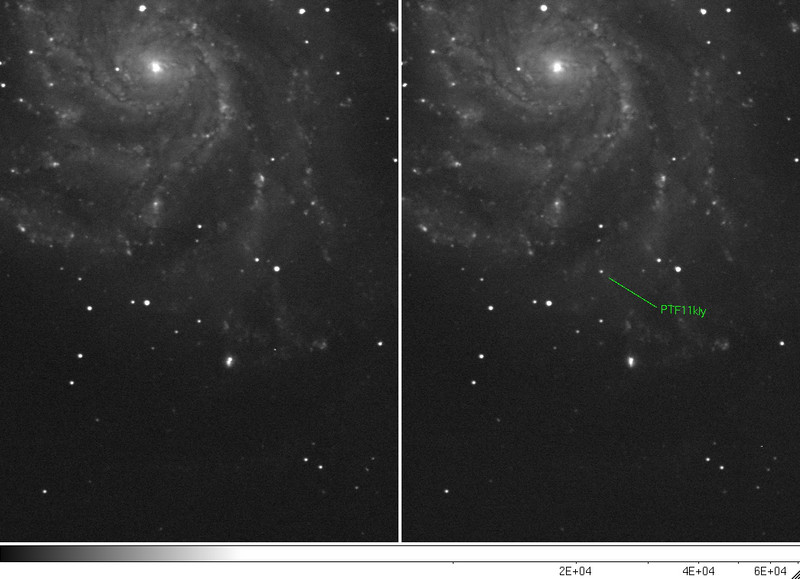 Am 24. August wurde in M101 von der Arbeitsgruppe Palomar Transient Factory, die eine automatische Himmelsdurchmusterung betreiben, eine Supernova entdeckt. Der Fund ist deswegen interessant, weil die Durchmusterung die Supernova (vermutlich vom Typ Ia) in einem sehr frühen Stadium erwischt hat, nämlich bei einer Helligkeit von 17.2 mag. Wenn sich die Lichtkurve normal entwickelt, könnte die Supernova eine Helligkeit von 11 mag am Himmel erreichen, was auch kleineren Teleskopen zugänglich ist. Weniger schön ist, dass M101 im ausgehenden Sommer und im Herbst tiefstehend am Nordhorizont nicht optimal zu beobachten ist. Immerhin ist M101 aber circumpolar.