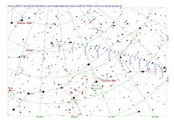 Februar 2012 | Am 2. und 3. Februar läuft der Komet an M92 im Herkules vorbei. Leider wird dieser Anblick durch den recht vollen etwas Mond getrübt. Zur Neumondphase im zweiten Drittel des Februar liegt aber dann die günstigste Beobachtungsperiode und der Komet wird mit ca. 6.5 mag seine maximale Helligkeit erreichen. Die günstigen Beobachtungsbedingungen sind aber eher für die Frühaufsteher geeignet. Mitte des Monats wechselt der Komet dann in das Sternbild Drache. |